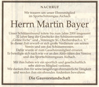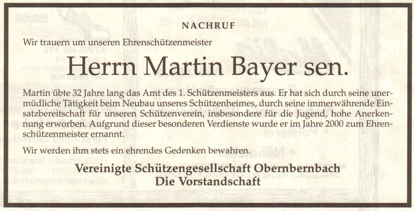 Im Jahre 1962 wurde er Mitglied bei den Vereinigten Schützen Oberbernbach. Wir trauern um einen Schützenfreund der dem Verein stets wohlgesonnen war. Die Schützen werden Ihm ein ehrendes Andenken bewahren.