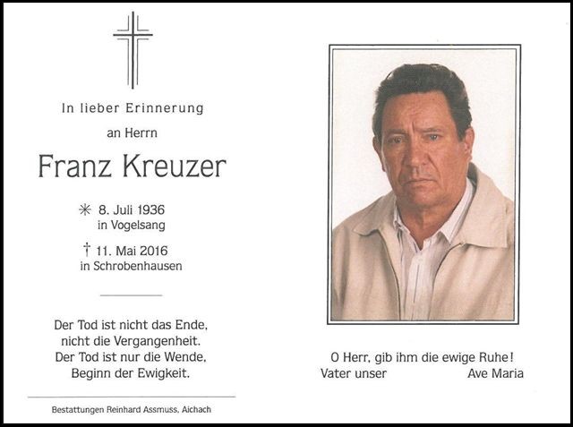 Die Vereinigten Schützen Oberbernbach nehmen Abschied von ihrem Mitglied Herrn Franz Kreuzer.