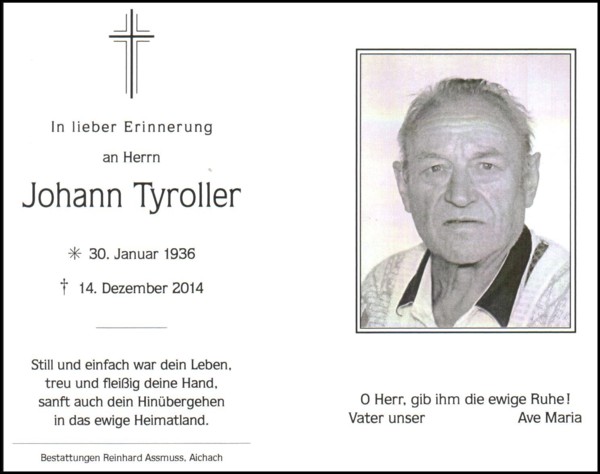 Die Vereinigten Schützen Oberbernbach nehmen Abschied von ihrem Mitglied Herrn Johann Tyroller.