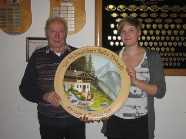 Anlässlich seines 75. Geburtstag stiftete Walter Wiedemuth eine sehr schöne Schützenscheibe und legte einen Teilerwert von 76,0 vor. Wer am nächsten an diesen Wert kommt, gewinnt die Scheibe. Theresa Beck gelang dies mit einem 75,1 Teiler und gewann somit die Scheibe. Auf Platz 2 folgte Stefan Goldstein (74,8) und auf Platz 3 Siegfried Weiß (74,7.)