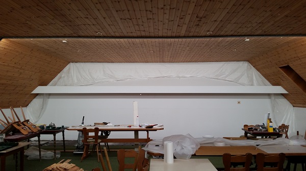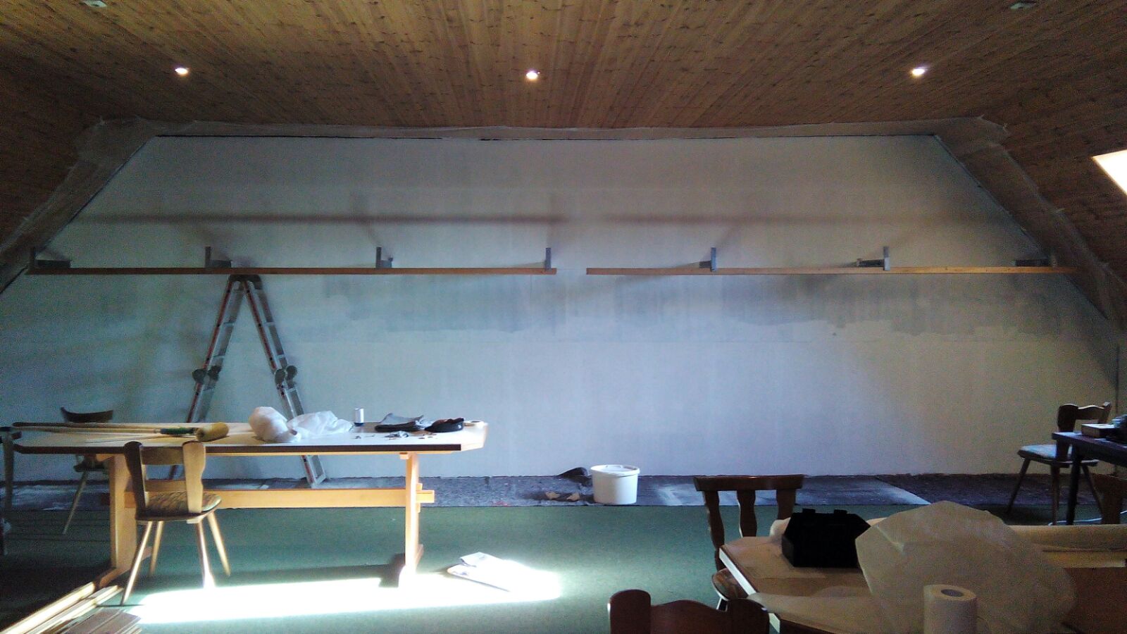 Hier ist der "Schießen" bereits mit Holzfaserplatten verkleidet. Unser Maler Wolfgang hat die Übergänge mühevoll gespachtelt und geschliffen.