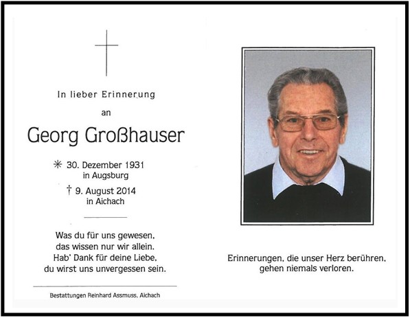 Die Vereinigten Schützen Oberbernbach nehmen Abschied von ihrem Ehrenmitglied Herrn Georg Großhauser. Er trat 1950 dem Verein bei und hat dem Verein durchgehend die Treue gehalten. Auch war er viele Jahre in der Vorstandschaft und im Vereinsausschuß tätig. So hat er 9 Jahre das Amt des 2. Schriftführes und 6 Jahre das Amt des 2. Schützenmeisters ausgeübt. Für seine Verdienste wurde Ihm 1988 das Protektor-Abzeichen verliehen. Auf den Schorsch war bei den vielen Arbeitseinsätzen des Vereins stets Verlass. Auch beim Bau des Sport- und Schützenheimes, wo er sehr viel Freizeit opferte, und mit Rat und Tat zur Verfügung stand.