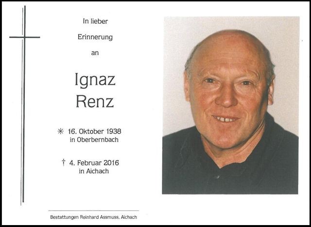 Die Vereinigten Schützen Oberbernbach nehmen Abschied von ihrem Mitglied Herrn Ignaz Renz.