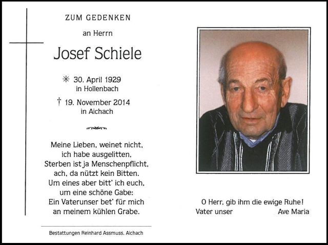 Die Vereinigten Schützen Oberbernbach nehmen Abschied von ihrem Mitglied Herrn Josef Schiele.