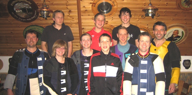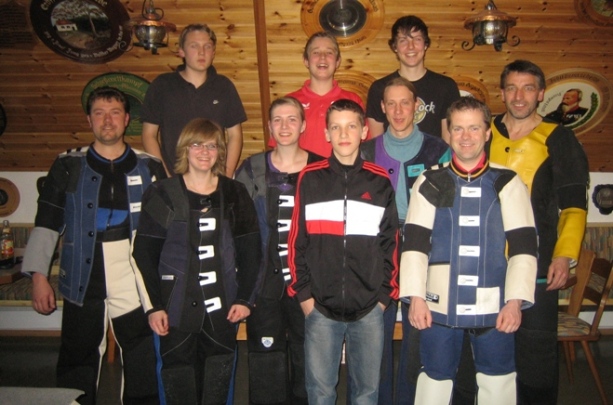 Beim Cup- Schießen der Vereinigten Schützen Oberbernbach wurden die Paarungen die gegeneinander Antraten zusammengelost. So hatte jeder Schütze seinen direkten Gegner, den es in der vorgegebenen Zeit von 10 Minuten für 10 Schuss zu bezwingen galt. Die Verlierer dieser Runde traten bei gleichem Modus wieder an die Stände. Wer diesen Vergleich verlor war endgültig ausgeschieden. Für die restlichen Schützen ging dies solange weiter, bis am Ende noch 4 Schützen übrig blieben. Diese Schützen traten dann im Finale gegeneinander an. Den 4. Platz belegte Stefan Goldstein mit 89 Ringen, auf Platz 3 kam Stefan Schneider (rechts) mit 90 Ringen, den 2. Platz erkämpfte sich die Nachwuchsschützin Theresa Beck (Mitte) mit 91 Ringen. Sieger mit 94 Ringen wurde Anton Heinrich.