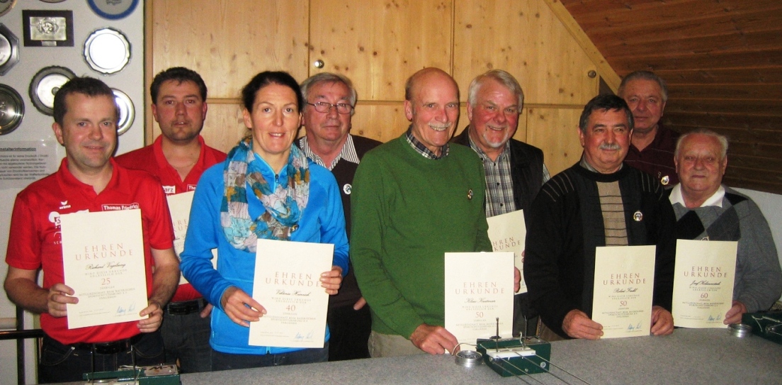Ehrungen für langjährige Mitgliedschaften. Von links, Richard Vogelsang, Stefan Goldstein, Viktoria Heinrich, Michael Schwarz, Klaus Kreitmair, Franz Regau, Robert Finkl, Heinrich Penthaler und Josef Kolanowitsch
