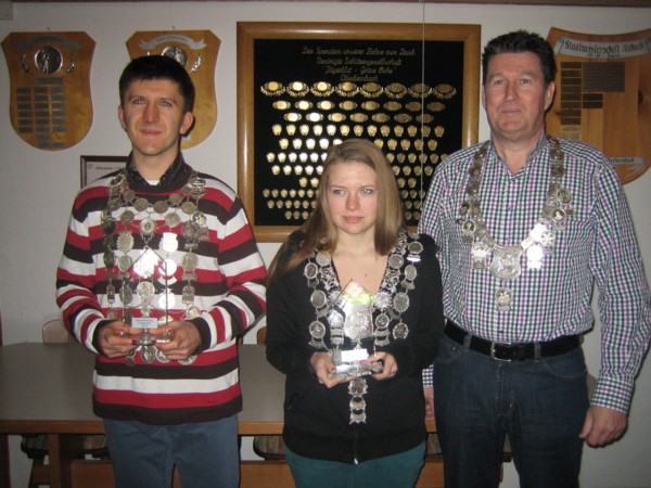 Nun wurde es so richtig spannend, denn es stand die Proklamation der neuen Schützenkönige für das Jahr 2014 auf dem Programm. Erstmals Schützenkönig in der Schützenklasse wurde mit einem 15,0 Teiler Markus Berchthold. Ihm folgten Theresa Beck 19,4 Teiler und Stefan Schneider mit einem 33,0 Teiler. König in der Disziplin Luftpistole wurde mit einem 73,8 Teiler Karl Beck, der somit seinen Vorjahrestitel verteidigen konnte. Zweiter wurde Klaus Hörmann mit einem 77,7 Teiler und den dritten Platz belegte Thomas Rebenyi. Die Könige in den Disziplinen LG und LP bekamen einen Glaspokal überreicht. Zusätzlich bekamen die drei Erstplazierten ein schönes Stück Geräuchertes mit nach Hause.