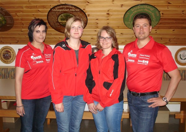 Im Bild von links, die erfolgreichen Schützen: Fuidl Nicole (366), Beck Theresa (385 mit einer 100 Serie), Weiß Kerstin (376) und Goldstein Stefan (377). In der Einzelwertung der Gauliga Gruppe 3 belegte Theresa Beck mit 373,1 R. im Schnitt den 1. Platz, und Kerstin Weiß mit 370 R. den 2. Platz.