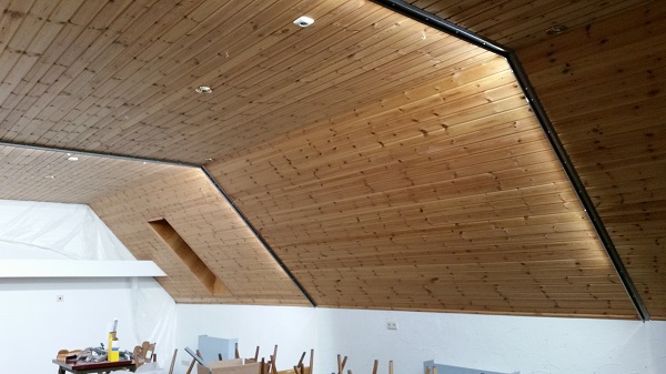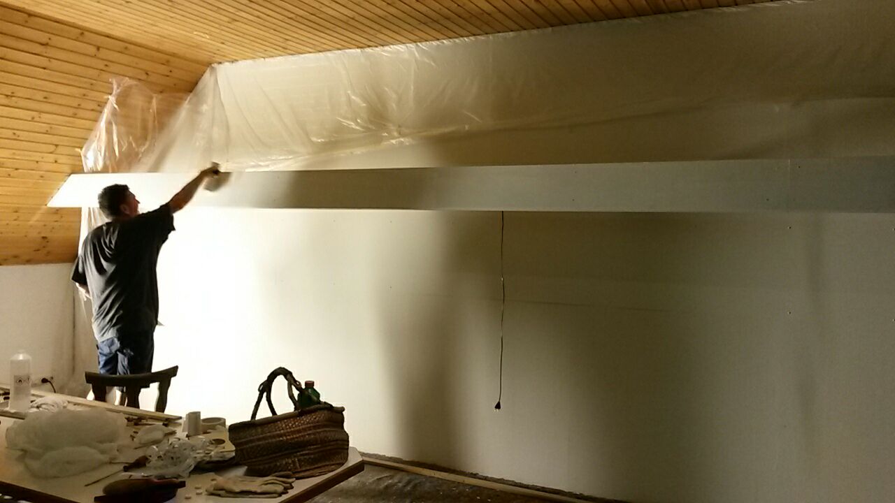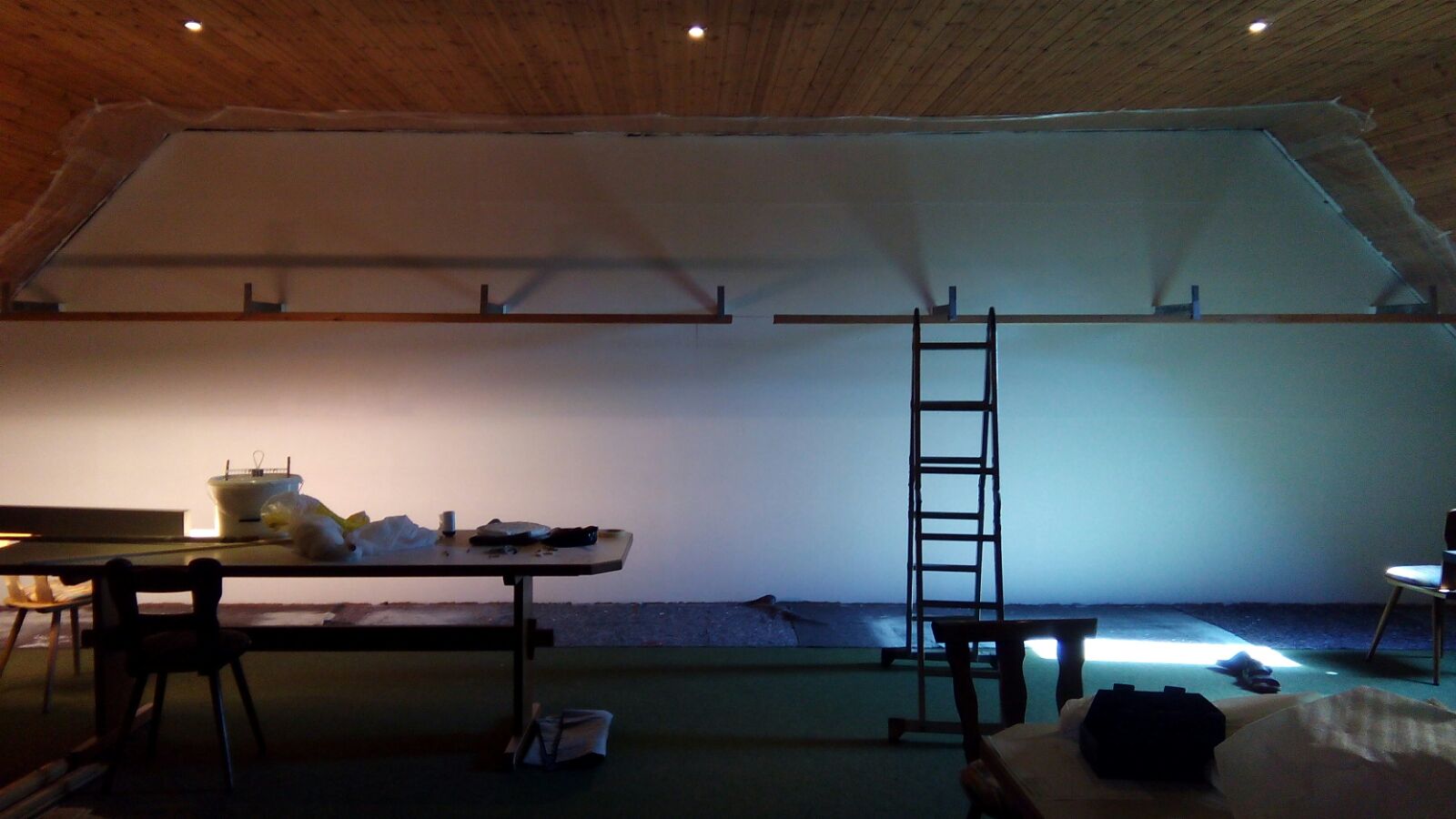 Hier ist der "Schießen" bereits mit Holzfaserplatten verkleidet. Unser Maler Wolfgang hat die Übergänge mühevoll gespachtelt und geschliffen.